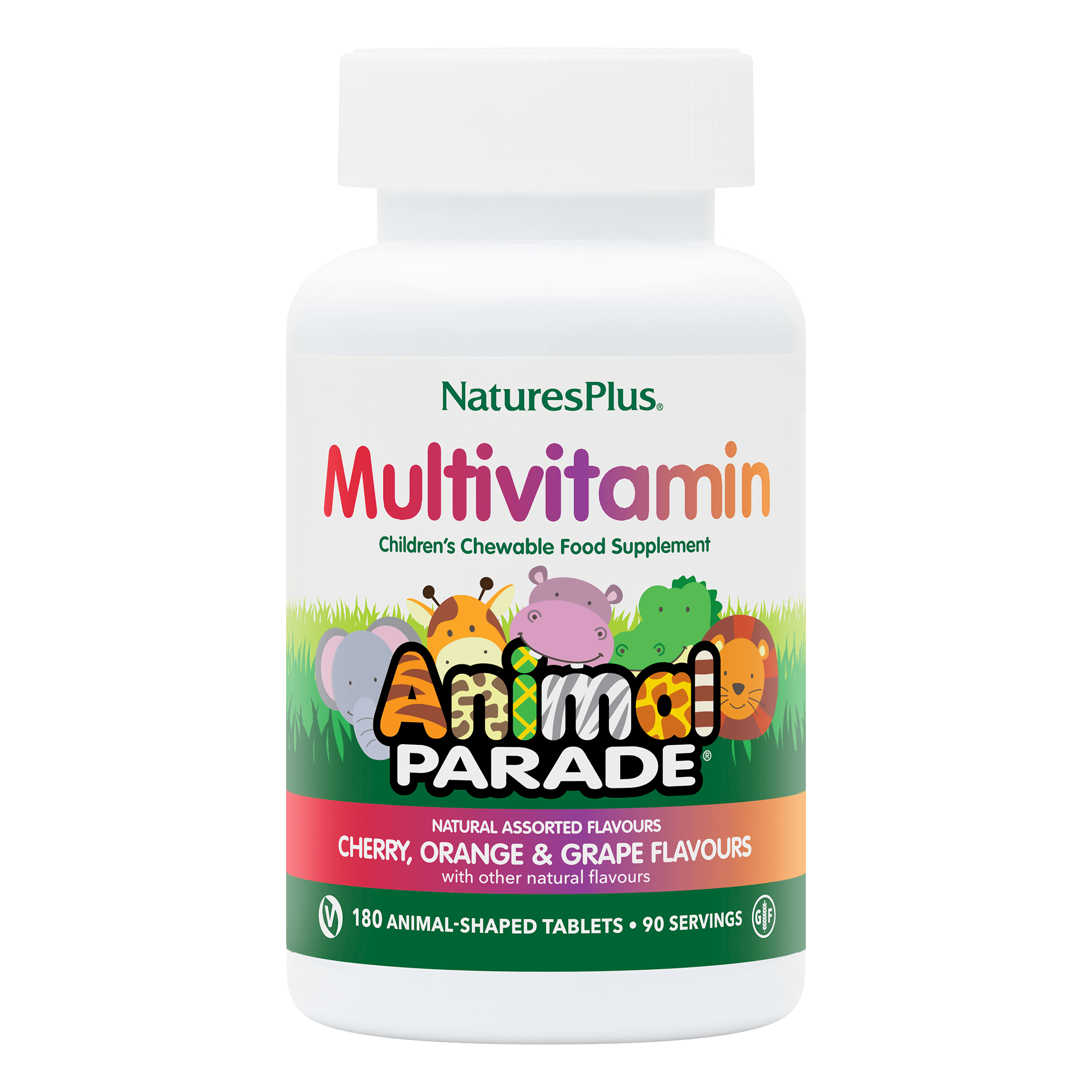 Delicious Natural Orange, Grape and Cherry flavoured Source of Life Animal Parade children's formula supplies the nutritional assurance all parents seek for their children, along with the great taste and animal shapes that kids love. Each chewable tablet supplies 16 vitamins and 8 minerals, as well as nature's most healthy organic whole foods, including spirulina, carrot, broccoli, whole brown rice and spinach. Combining the natural goodness of whole foods with a balanced profile of nutrients is what makes Animal Parade a complete dietary supplement formulated for your child.