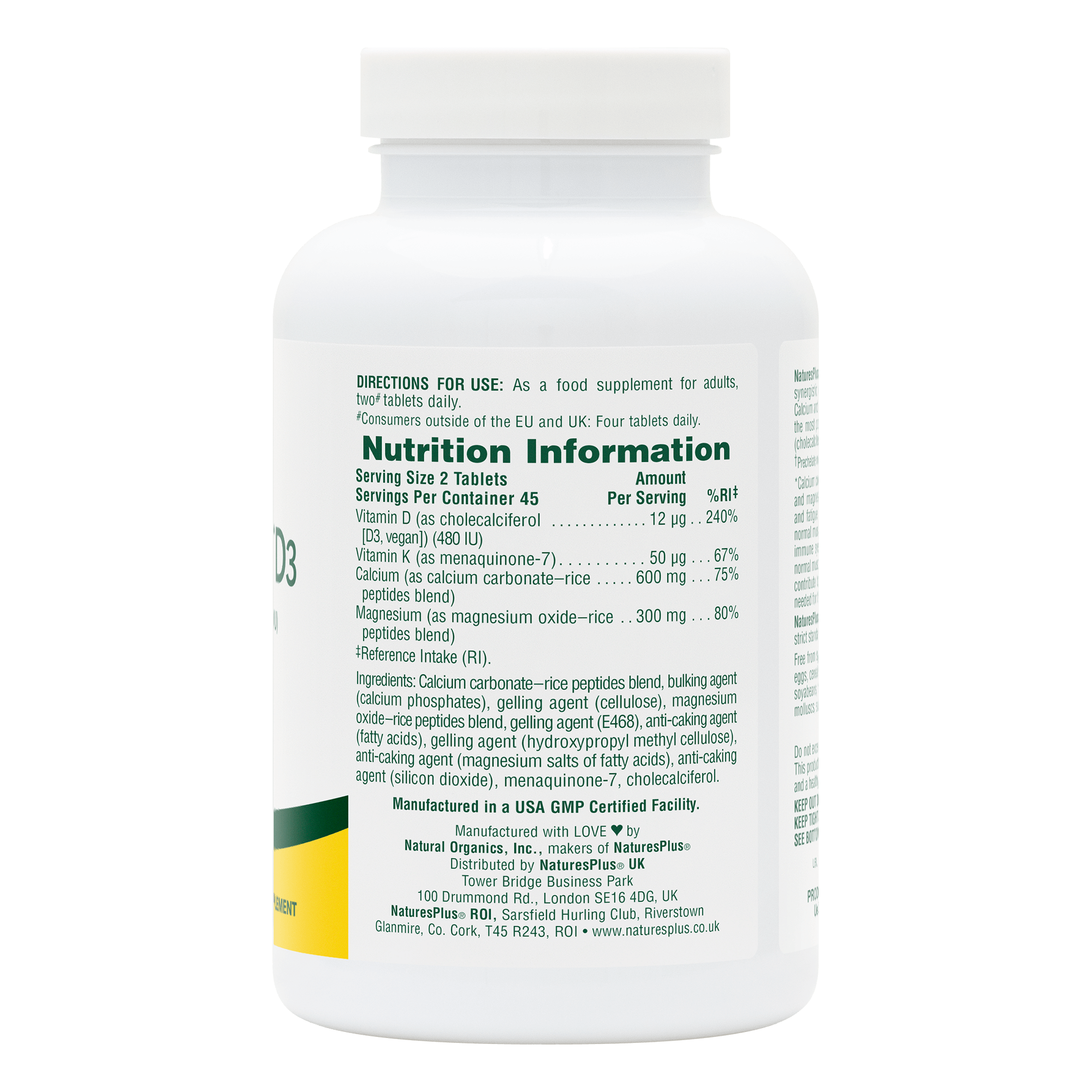 - BONE HEALTH SUPPLEMENT: NaturesPlus Cal/Mag/Vit D3 with Vitamin K2 provides essential nutrients for unparalleled bone support.* The calcium† and magnesium§§ are specially chelated with non-GMO rice protein and work dynamically with highly powerful and bioavailable forms of vitamin D3 (cholecalciferol) and vitamin K2 (menaquinone-7). Calcium and vitamin D help to reduce the loss of bone mineral in post-menopausal women††; low bone mineral density is a risk factor for osteoporotic bone fractures.
